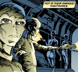 This is an unnamed, spacefaring species of grey-like hairless humanoids with large eyes, five-fingered hands and light-blue blood.
