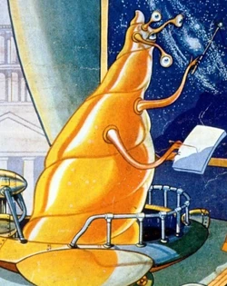 Although they possess three legs, modern Andromedans are never seen separated from their mobile hovercrafts. Their legs are short and naturally too slow to be useful, so they spend the majority of their existence within their crafts, this being comparable to how most Humans spend the majority of theirs wearing clothes.