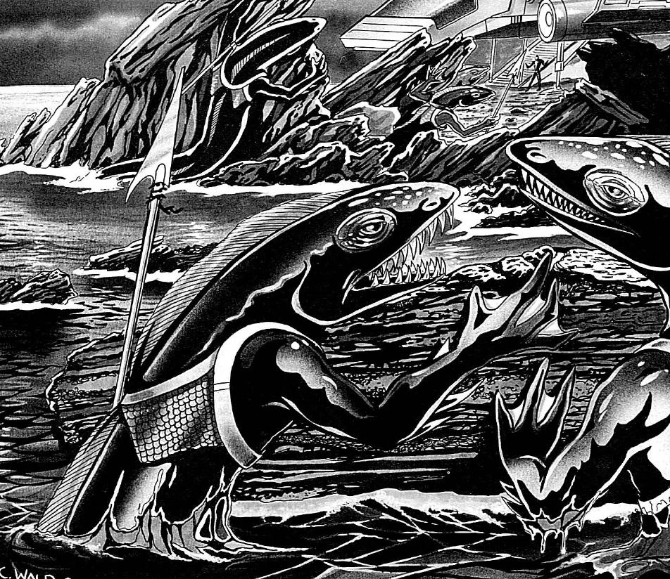 Anguilla are elongated aquatic creatures, and can be distinguished from Earth eels by their long arms ending in powerful hands and webbed fingers (for propelling them through the water) and infrared vision.