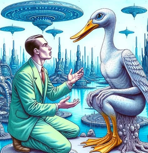 Apicians, resembled nothing more than oversize ducks, ducks four feet to four feet six in height. At their wing tips, they had developed juxtaposed thumbs. They were paddle-shaped and sufficed to feed the Apicians. They had moderate telepathic powers.