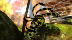 Arachnodes themselves are about the size of a standard Koppaite at the base, only wider thanks to their legs. They have eight legs in total like spiders, with a rounded body. They also have numerous patterns of circles, rings, and stripes of yellow along their black body. When not hunting prey, it appears more like a yellow and black egg, with its legs invisible and retracted into the body as it waits for prey to come near.