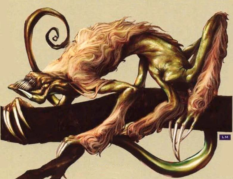 The brown-skinned body of an Asyyyriak was covered entirely with long, brown and green hair, useful for camouflage amongst the stringy forest moss. Adult Asyyyriaks averaged one to two meters in length.