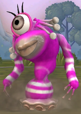 Aw Sembli are pink-skinned creatures with white stripes along their arms and legs, with hair-like details on their heads. They are cyclopic and move around on only one leg, making much of their movement rather salially. Their bodies are stout, with their slim arms connecting near the head, the arms ending in stick-like fingers. Their foot is made up of numerous suction cups.