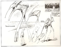 Beach-Runners are long-legged bipedaliens native to the planet of Darwin IV. They dwell in the littoral zone, around the Amoebic Sea. Virtually nothing more is known about this species, but their name and anatomy strongly indicate cursorial habits. They get their name from their habit of dashing along beaches.