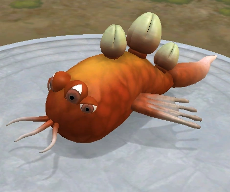 These simple creatures don't have any legs, still sporting much of their water-based anatomy for a semi-aquatic lifestyle. They have a set of fins to drag along the ground, and a simple gill-like mouth to suck eat soft-bodied fruit. Its four eyes and poison sacs evolved to better survive on land.