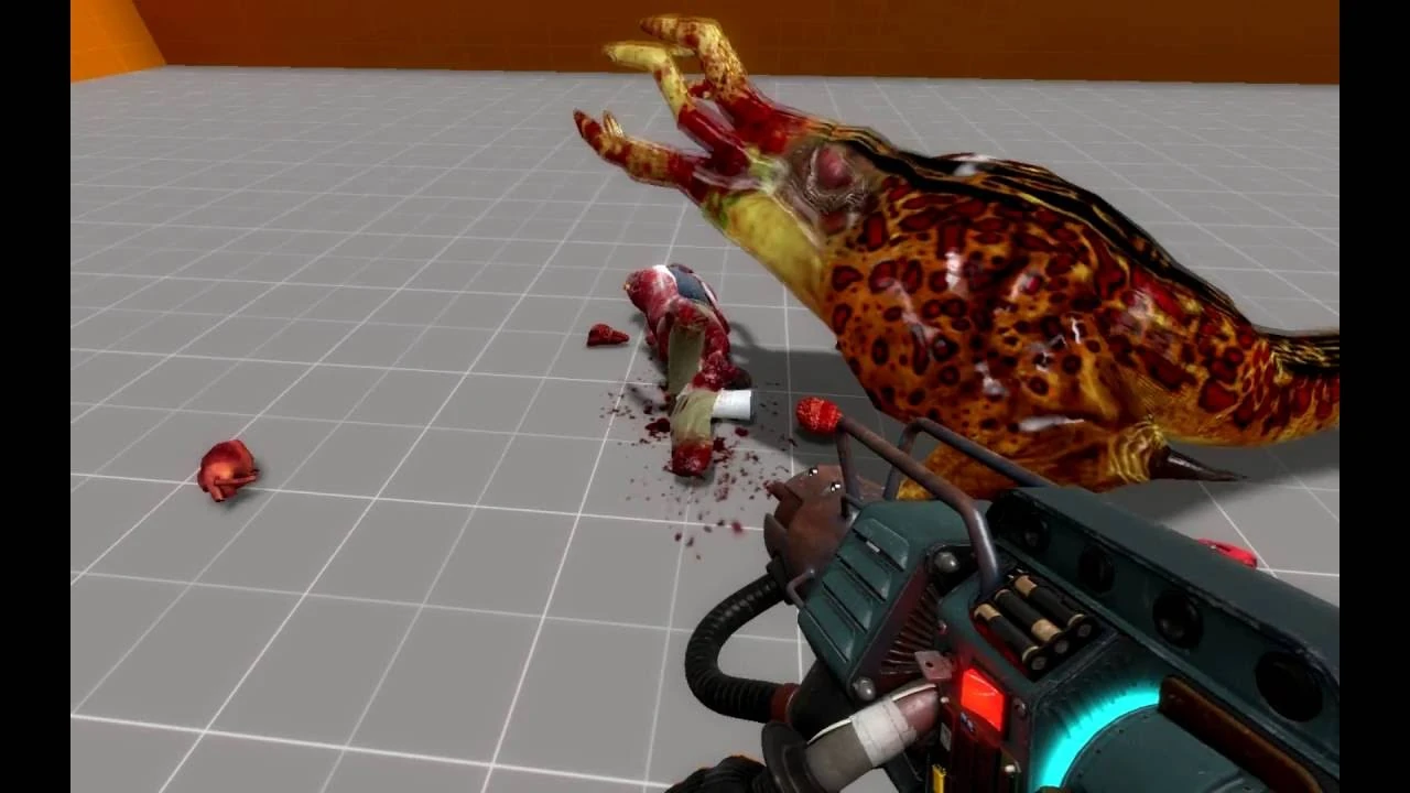 A Black Mesa (HL2 mod) rendition of the Bullsquid eating a gibbed scientist. This rendition makes them look more predatory, having forward-facing eyes.