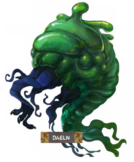 Daelns resemble large green jellyfish, roughly 10 feet long and weighing about 200 pounds. They have long purple tentacles on the underside of their body, and no other visible organs. They are capable of modifying their body shape and chemistry, and can merge together to combine traits.