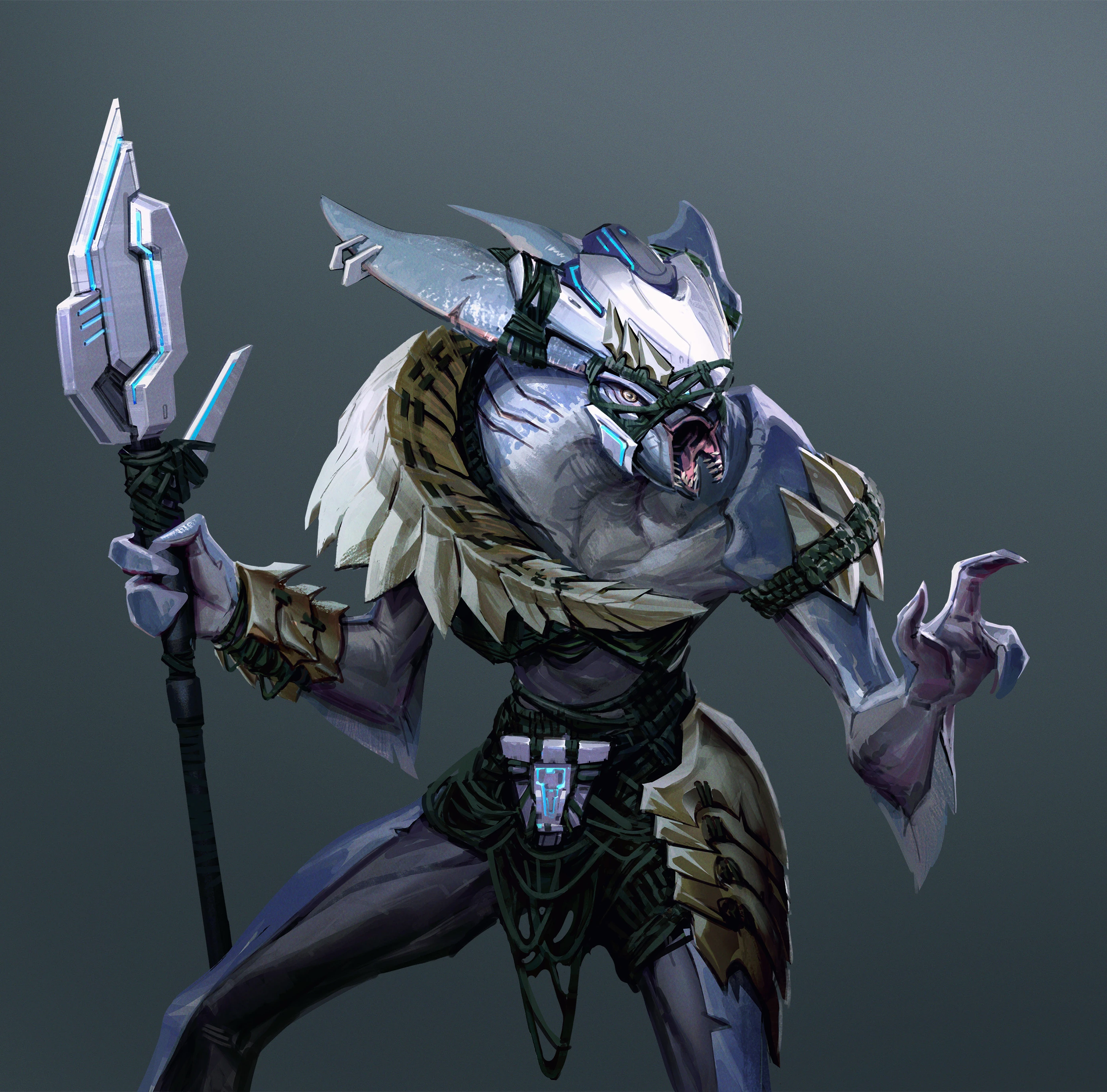 Dazreme are covered in fine layers of placoid scales of various colours. They have three fingers on each hand, including an opposable thumb, and feature webbing running up their arms. They feature gills on the sides of their necks, facilitating their underwater breathing, and feature heads similar to that of a Shark and a split pair of lower mandibles.