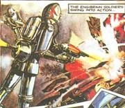 Engibrains were the humanoid robotic servants of the Monstrons. Kenex and Yeq used an army of Engibrains in their attempt to conquer Skaro. Although the robots succeeded in entombing the Daleks' city, they were destroyed by the Dalek the Monstrons had captured when it sacrificed itself by setting of a volcano.