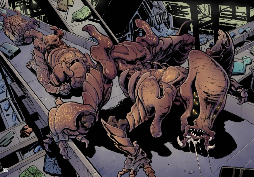 The Ethreth Twan possess red carapace. They possess six eyes and mandibles, almost like insects. Ethreth Twan are registered as inorganics according to scans. They are capable of folding themselevs into vessels that resemble trunks, which are often mistaken as luggage.