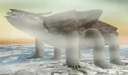 Striding over the icy terrain of future Europa, this predator is a massive creature supported by six columnar legs. It is about the same size as an elephant. The carapace on its back is made out of cellulose fibers and serves as a thermal insulant. Its blood contains antifreeze agents, and its metabolism is slow in order to conserve energy. It feeds on fish-like organisms from local pools that are speared with a retractable harpoon-shaped appendage on its head.