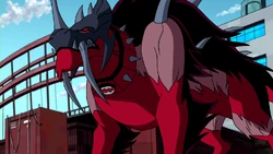 Evolved Panuncians resemble normal Panuncians but with crimson red fur, horns on their bodies, a large horn on their nose, an armored head with two horns, and larger fangs. Patches of fur appear to be missing, exposing peach-colored skin.