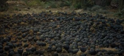 Gobbles are rooted to the earth, in clusters. The top part of the head that peaks above the surface resembles blue pod shaped flowers that remain stationary when left alone. When an object or prey lands within these gobble clusters, the plants work in tandem opening the jaws to grip the prey and tear it to shreds.