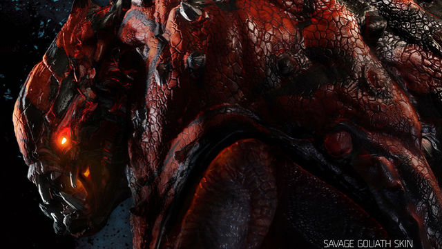 Goliath is a upright saurian monster, similar in appearance towards a mix of dinosaur and primate features. It has broad shoulders, long powerful arms, and a thick neck, attached to a muscular, almost human-like torso. Its tail is small, but also broad and spiked. Its small jaws have a surprisingly huge amount of power, a bite force of 100,100 pounds per square inch. Its hide is covered in bony plates, and spines along the shoulders.
