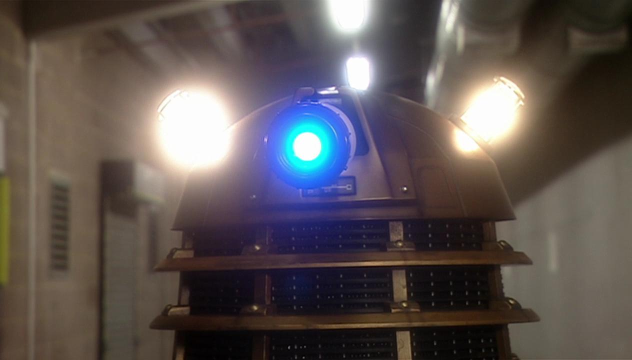 ricocheted off its armour. As one of the Guards (a woman named Di Maggio) led Rose and Adam away, the Dalek headed for a computer screen and - using its manipulator arm - began to absorb energy; restoring its armour to its pre-damaged state. The energy it absorbed drained the base (with only the emergency power intact), the power supplies for all of Utah and even drained the entire west coast of the USA of its power. In the process, the Dalek also absorbed the entire Internet - giving it complete knowledge of Earth. It was also able to use Earth's Satellites and Radio Telescopes to search for the Daleks, but found nothing. Having absorbed all the energy it needed, the Dalek tested its gunstick before activating its forcefield to protect itself. As more guards arrived, they open fired on the Dalek from both in front and behind it. However, the Dalek's force-field melted the bullets before they reached its armour, while a new adaption allowed its midsection to spin around without the Dalek moving - allowing the Dalek to effortlessly kill all the guards before continuing onward.