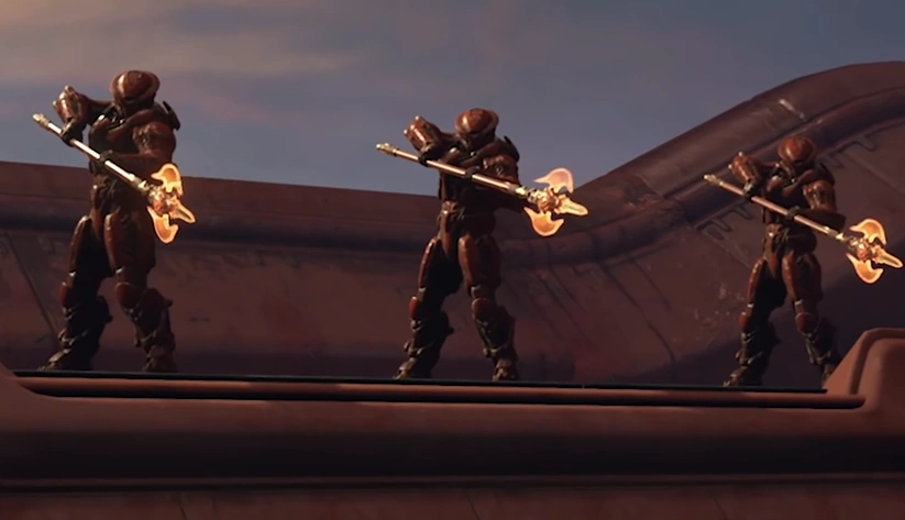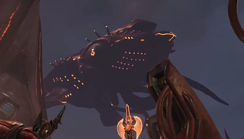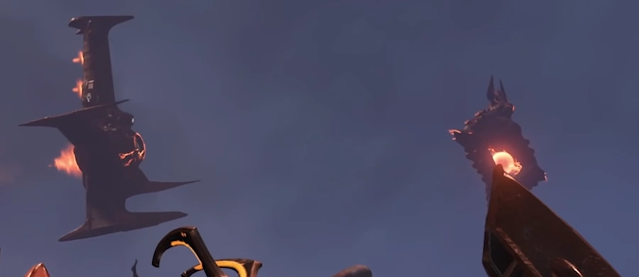 Jekkadian warships are known to have at least three variants: one that resembles an inverted cross, one that carries a ball of energy, and another, larger one, which appears to have several tentacles protruding from it. The inverted cross-type ship is known to be a form of transport, able to carry passengers from one location to another. Other defense assets include dual-barrel anti-air turrets, laser grid projectors, and fixed platform-defense cannons. An unknown technology takes the form of flying spheres, possibly robotic, with a single red optic. Jekkadian technology made after the realm's corruption, such as the weapons and armor of the Demonic Troopers, are said to be forged from hate and suffering. Jekkadians appear to have mastered and adopted biotech in certain areas, as seen with the guns of the Demonic Troopers, although the majority of their technology has been constructed with metal.