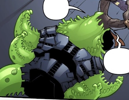 The Jellinoid are a green semi-solid species. When they are solid they appear as hulking bipedal four armed amoebas. Physically attacks do not seem to faze them as they can absorb an attack or even an assailant into their goo bodies.