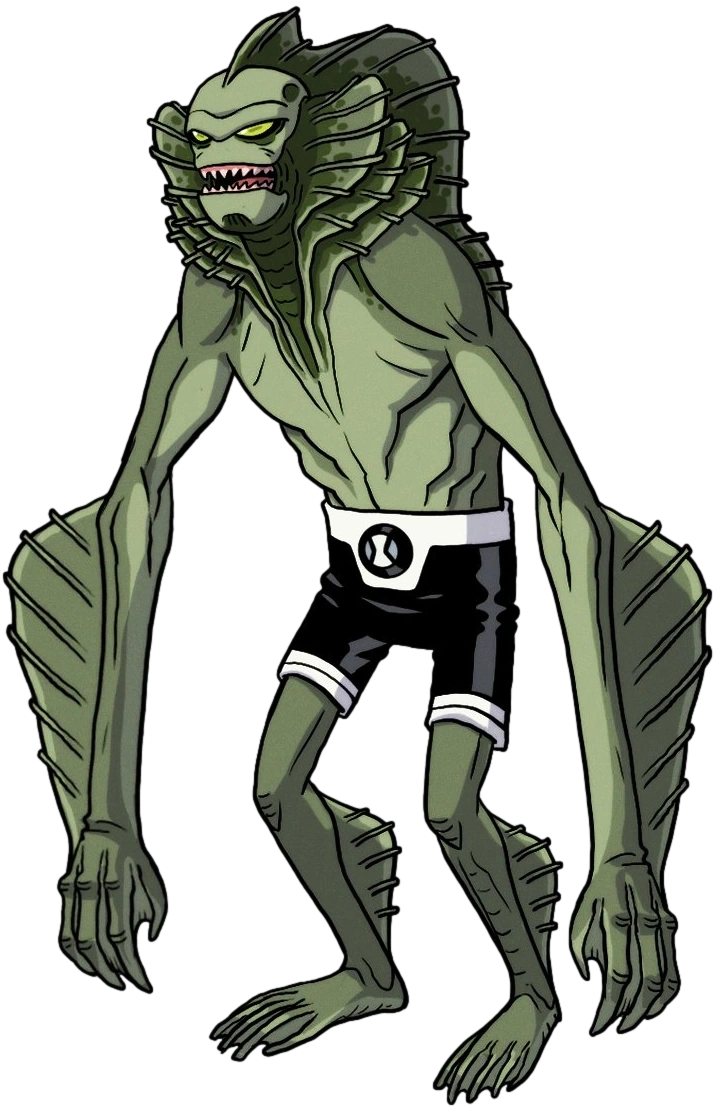 Millgans are 7-feet-tall[1] monstrous fish-like aliens with muted dark green skin, sharp teeth, yellowish-green eyes with darker green pupils, long and slimy arms, webbed four-finger hands, webbed feet, and eight gills on their stomachs. They also have fish fins on their backs and each of their limbs, and six more on their necks.