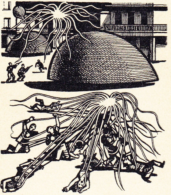 While presumably aquatic, the Coelenterates have never been observed in their natural habitat. The only known encounters have involved featureless metallic tanks that crawled out of the seas. From these tanks emerge spherical gelatinous masses that can rapidly contract their bodies, launching out multiple long tentacles with adhesive properties. The tentacles snatch animals (including but not limited to Humans) and pull their helpless victims with incredible strength towards the central mass when they are retracted.