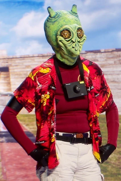 This unnamed alien species is a friendly, green-skinned humanoid species with large, gecko-like eyes and make bird-like chirping sounds with their multiple nostrils. An unnamed member visited Earth at some point as an interstellar tourist, who thinks he fits in with the Humans when he really doesn't.