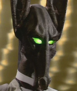 Osirians, despite their name, looked somewhat like the traditional depictions of Set. They had grey skin, jackal or donkey-like heads with large, square ears and bright green eyes. They had expanded brain-cases and a cerebrum like "a spiral staircase", which means they particularly liked puzzles. Osirians also had a wide variety of advanced psychic powers, including mental and physical projection, mind control and telepathy.