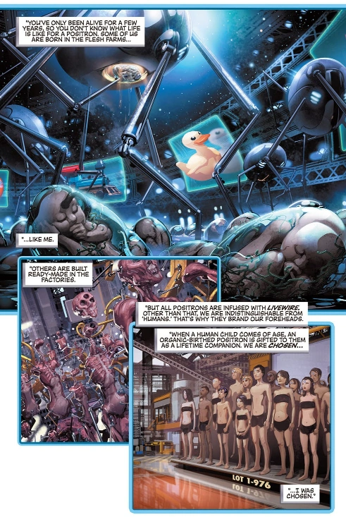 Positrons are a class of artificial intelligence either made in factories or grown in flesh farms of New Japan. All Positrons are infused with livewire making them able to project emotions indistinguishable from humans. In order to differentiate, the Positrons are branded with a blue circle on their forehead. Positrons are supposedly unable to lie however they are able to bypass this restriction through loopholes, by giving parts of the whole truth. They are unable to hurt humans and follow their comands. Positrons age just like their human companions.