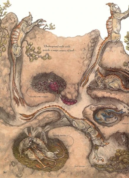 Progoggs have large clawed forelimbs to aid in digging, short hindlimbs and a very long forked tail. They also have strong incisor teeth and a short horn on their snouts. Profoggs are herbivores, their main food source being the subterranean Molo Seeds.