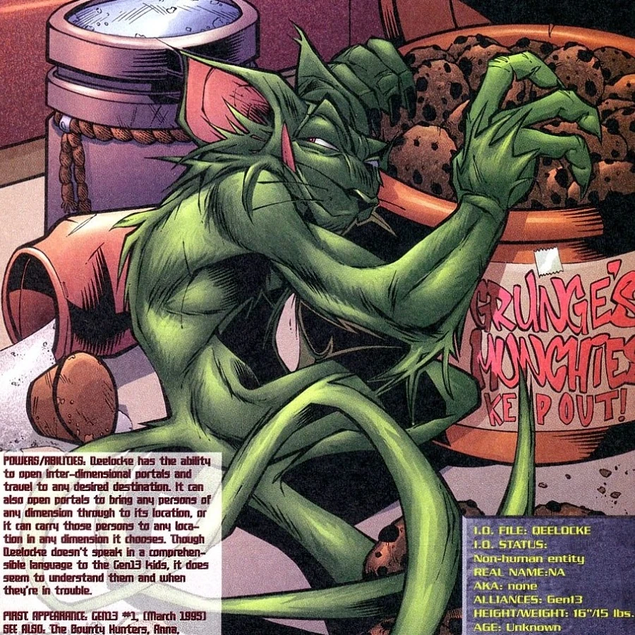 The Qeelocke is a unique animal that came to Earth from another dimension. He can open portals to travel planet wide, even up to the moon. He came to Earth to escape the Bounty Hunters. He ended in a club's toilet and hide in Gen 13 Freefall's jacket. When the hunt party came to claim its prize, they faced the whole Gen 13 team, coming at the rescue of Roxy after Lynch pinpointed the distortion created by the Bounty Hunters' teleportation. After that, the pet adopted Freefall, and they fell for the little furball. Only Lynch saw the potential threat of keeping a creature people were ready to cross dimensions to get.