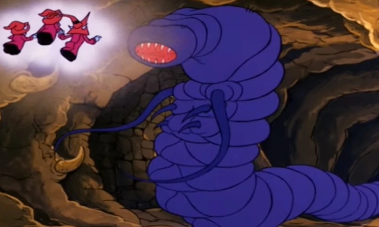 Scargs are giant blue-skinned worm-like creatures with segmented bodies and three pairs of tentacles on their chests. They have no visible eyes, and their faces consist solely of an oval-shaped red mouth with numerous sharp teeth.