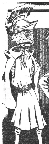 Their physical appearance has been described as grotesque by Humans. They have a tall stature, deep-set compound eyes, large chests, thin legs with knobbed knees and small hoof-like feet. Their arms are small, but terminate in toothed pincers which are strong enough to break steel. Their internal fluids are green.