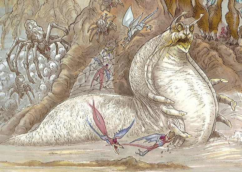 Swamp Slugs have 24 pairs of short legs, and large yellow eyes that are able to see clearly beneath the dark swampy waters. They also have short antennae used for echolocation.