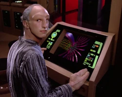 However, as soon as he started taking interest in the Federation, the Traveler presented himself, without revealing his abilities, but offering knowledge of propulsion systems in exchange for passage in Starfleet vessels so that he could experience "[our] reality". He became an assistant to Human engineer Kosinski, who developed formulas that would allegedly allow for much faster warp travel. Unbeknownst to anyone, Kosinski's methods didn't actually work, but he still managed to achieve results thanks to the Traveler, who deliberately took no credit.
