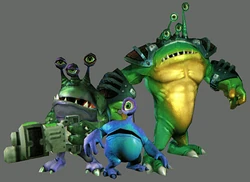 The Tyhrranoids are a race of aggressive stalked-eyed aliens native to planet Tyhrranosis. During Nefarious' campaign against organic lifeforms, they aided the the mad doctor, being too dim-witted to realize they themselves were organic lifeforms.