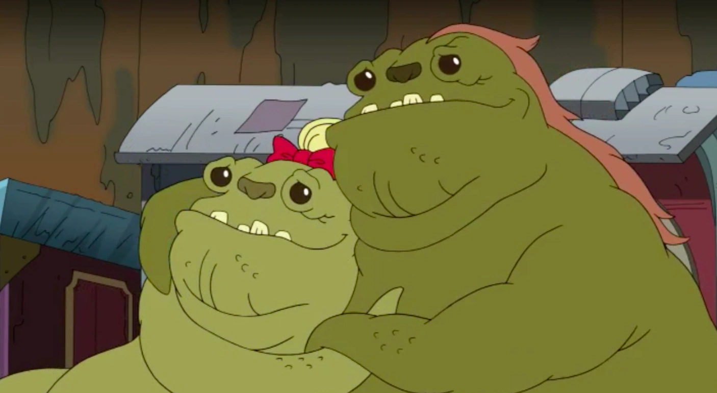 These creatures appear to be large Hutt-like aliens, but with visible hair, small eye stalks, bottom teeth shown on their mouths, tentacle arms, and visible noses.