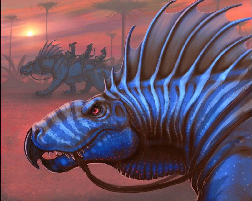 Looking similar to a Dimetrodon, but with blue stripped skin, and a short sail that sprouted from its neck. An ancestor of the Kozorrs, it is longer and smoother-looking, like salamanders and they walk very low to the ground with their legs sticking out, like alligators. It was doesticated and used as a mount by the Mipedians.