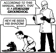 These furry quadrupedal beings are similar in appearance to Earth's mammals. But while Earth groundhogs are harmless herbivores, the Venusian kind appears to be carnivorous and has the habit of attacking possible aggressors by biting them in the nose, causing six weeks of nose pain.