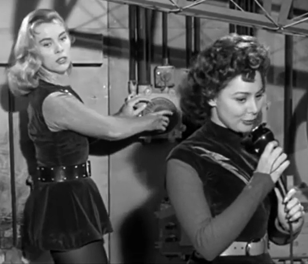 Female Zirconian spaceship crewmates wear dark sleeveless minidresses over tight, lighter, long-sleeved shirts, light nylon leggings, and white-tipped high-heels. In addition, they have a lightning bolt-like symbol on their right breasts. They are also known to have belts that are either white or black, with any significance in the colors unknown, and do not appear to carry any weapons, likely due to the peaceful nature of their missions. Any differences for male uniforms are unknown.